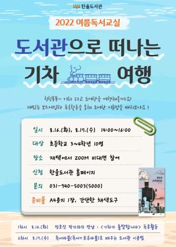 파주시 한울도서관은 오는 16일부터 17일까지 어린이를 위한 여름독서교실 ‘도서관으로 떠나는 기차 여행’ 프로그램을 운영한다고 밝혔다.