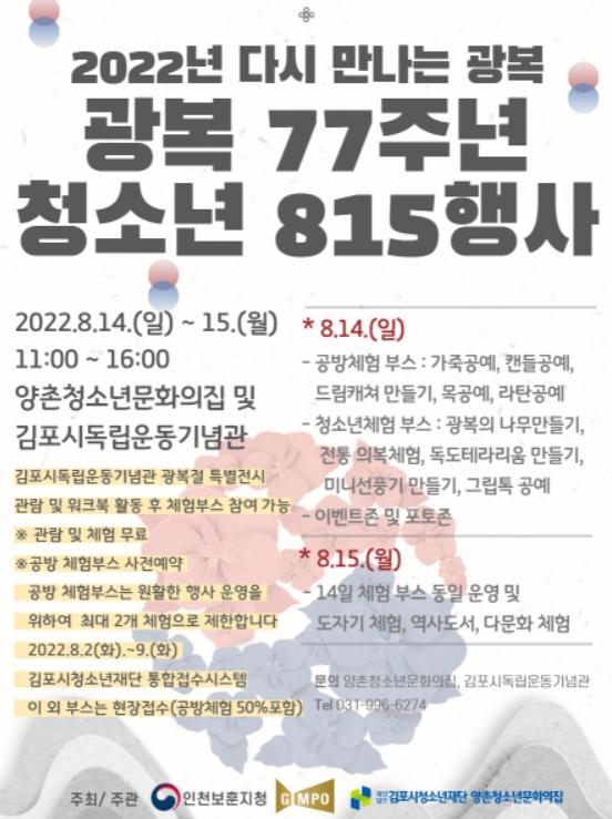(재)김포시청소년재단 양촌청소년문화의집은 광복 77주년을 기념하는 청소년 8.15 행사 [다시 만나는 광복]을 개최한다고 밝혔다.