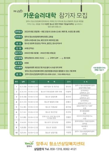 양주시 청소년상담복지센터는 오는 19일까지 제23회 카운슬러대학 참가자 30명을 선착순으로 모집한다.