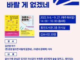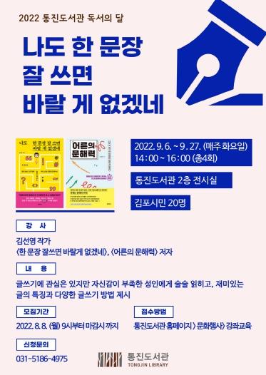 김포시 통진도서관은 9월 독서의 달을 맞아 9월 6일부터 9월 27일까지 매주 화요일(4회) 14시부터 2시간 동안 김선영 작가와 함께 성인을 위한 글쓰기 강연 '나도 한 문장 잘 쓰면 바랄 게 없겠네'를 운영한다.