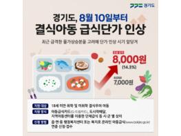 급격히 오르는 물가에 맞춰 급식 지원단가를 높여야 한다는 지적이 사회 곳곳에서 제기되는 가운데 경기도가 8월 10일부터 결식아동 급식단가를 1식 7천 원에서 8천 원으로 14.3% 인상한다.