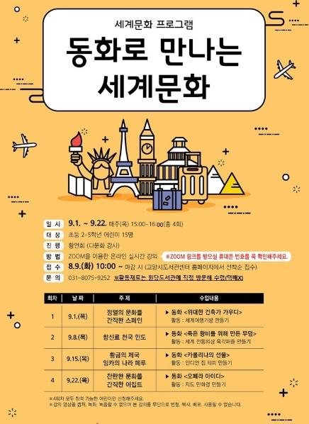 고양특례시 원당도서관이 9월 1일부터 22일까지 어린이 다문화 프로그램인 '동화로 만나는 세계문화'를 온라인으로 운영한다.