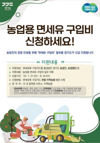 신청기간은 관내 지역농협(면세유류 관리기관)에 방문하여 오는 8월 24일까지 신청하면 된다.