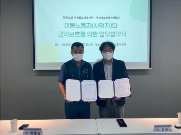 부천시소상공인연합회(회장 신방식)와 한국노총 부천김포지역지부(의장 박종현)은 이동노동자(사업자)의 권익보호를 위한 업무협약을 체결하고 쉼터를 비롯한 권익보호를 위한 사업에 함께 나서기로 했다.