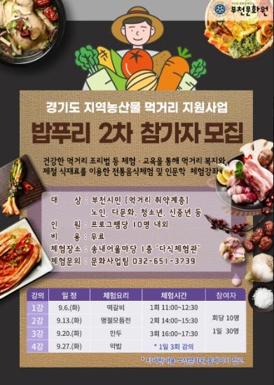 경기도에서 생산된 농산물을 활용해 지역경제를 활성화하고 우리 농산물을 활용한 먹거리 활성화 사업을 통해 음식문화를 전파하는 '2022년 지역농산물먹거리지원사업'공모사업에 부천문화원이 사업 추진기관에 선정되었다. 문화원은 ‘공유주방형’사업으로 공간 리모델링을 통해 교육 공간조성 및 전통음식, 음식치유를 활용한 지역농산물 활성화 사업들을 운영하여 총 40회 400명을 대상으로 음식문화 향유 활동을 진행중에 있다.
