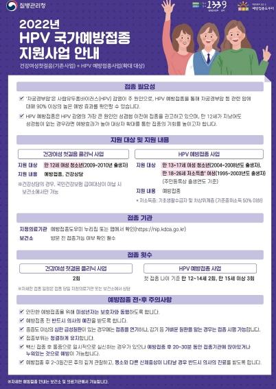 당초에는 만 12세 여성 청소년만 예방접종 지원 대상이었으나, 이번 지원 확대로 만 12~17세 여성 청소년(2004~2010년생)과 만 18~26세(1995~2003년생) 저소득층(기초생활수급자 또는 차상위계층) 여성까지 그 대상이 확대됐다.