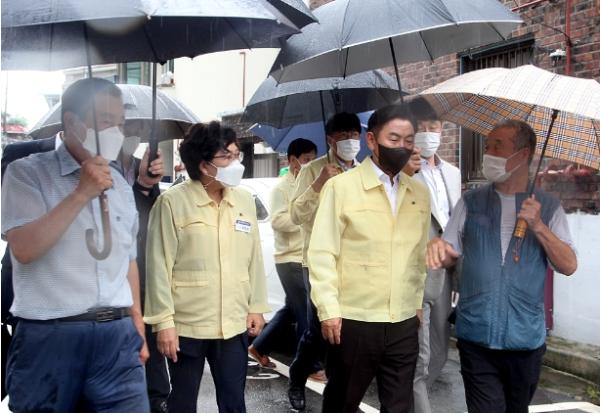 김동근 의정부시장은 8일 발생한 집중호우에 따라 주택침수 피해가 발생한 가능동 지역을 긴급 현장점검을 실시하고 각 부분의 피해복구책 마련을 지시했다.