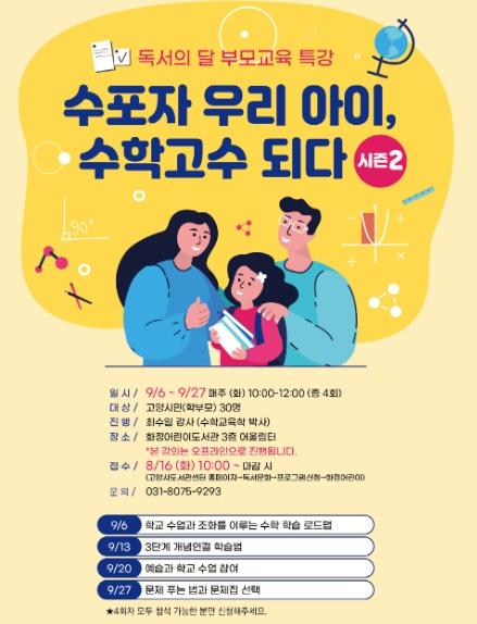 고양특례시 화정어린이도서관이 독서의 달을 맞이하여 부모교육 특강인 '수포자 우리 아이, 수학고수 되다! 시즌2'를 운영한다.