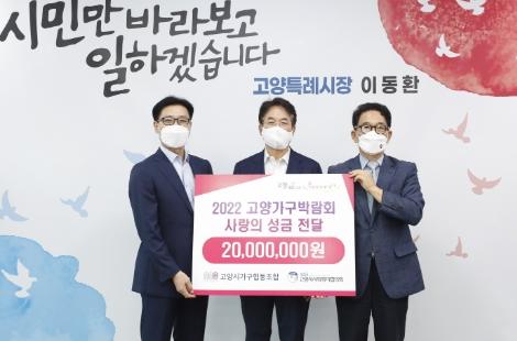 이번에 기탁된 성금 2천만원은 고양시가구협동조합에서 2022 고양가구박람회 참가업체들의 자체부담금 일부를 모아서 마련한 것으로 고양시사회복지협의회를 통해 관내 취약계층에게 전달할 예정이다.