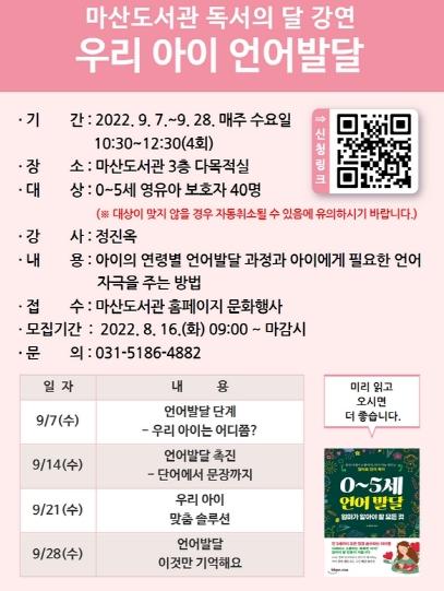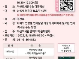 김포시 마산도서관은 2022년 독서의 달을 맞아 '우리 아이 언어발달'을 오는 9월 7일부터 9월 28일 매주 수요일 10시 30분에서 12시 30분까지 4회에 걸쳐 운영한다.
