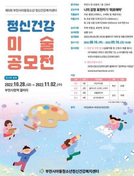 부천시와 부천시아동청소년정신건강복지센터는 8월 16일부터 9월 16일 오후6시까지 아동·청소년을 대상으로 ‘제5회 정신건강 미술공모전’을 실시한다.