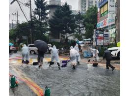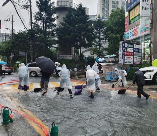 의정부시 장암동은 9일 집중호우로 도로 곳곳이 침수됨에 따라 수해 현장에 직접 뛰어들어 수해 예방을 위한 대응 조치를 실시했다.
