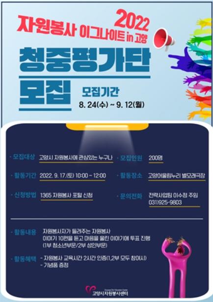 참여를 희망하는 사람은 8월 24일부터 9월 12일까지 1365 자원봉사포털사이트에 게시된 자원봉사 이그나이트 in 고양 청중평가단 모집공고를 확인한 후 신청하면 된다.
