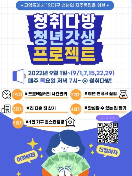 교육은 오는 9월 1일부터 매주 목요일 저녁 7시부터 2시간 가량, 총 5회에 걸쳐 고양시 청년공간인 청취다방에서 진행된다. △프로 N잡러의 시간관리 △청년 찐테크 꿀팁 △집다운 집 찾기 △안심할 수 있는 집 찾기 △1인 가구 홈스타일링 내용 등을 다룬다.