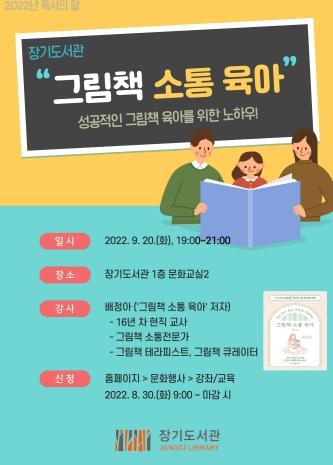 김포시 장기도서관은 9월 독서의 달을 맞이하여 ‘그림책 소통 육아’ 프로그램을 9월 20일(화요일) 저녁 7시에 장기도서관 문화교실2에서 운영한다.