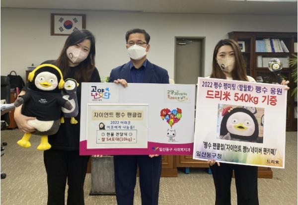고양특례시 일산동구는 지난 29일 ‘고양난다(복지나눔 1촌 맺기)’사업의 일환으로 ‘자이언트 펭TV’ 네이버 펭수 팬클럽으로부터 쌀 540kg(10kg 54포)를 전달 받았다.