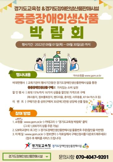 경기도교육청은 9월 1일부터 30일까지 2022년도 중증장애인생산품 구매 박람회를 비대면으로 진행한다.