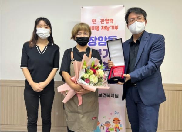 의정부시 장암동주민센터는 8월 30일 ‘J헤어 정미애 원장’을 우리동네 나눔리더 2호로 선정하고 감사패를 수여했다고 밝혔다.