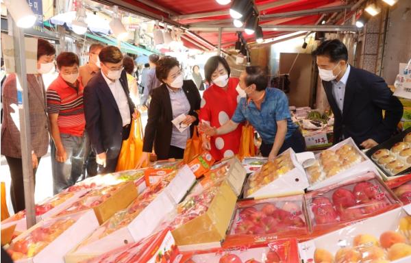 염종현 의장을 대신해서 남경순 부의장과 김판수 부의장은 7일 오후 북수원시장과 화서시장을 각각 방문하여 추석맞이 장보기 행사와 정담회를 진행하고, 시장상인회 회장과 함께 올여름 태풍과 폭우로 인해 최근 농산물 가격상승으로 어려움을 겪고 있는 시장 상인들을 만나 격려했다.