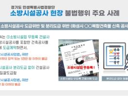 경기도 특별사법경찰단은 지난 6월 7일부터 8월 31일까지 연면적 5천㎡ 이상 도내 대형 공사장 50곳을 대상으로 소방시설공사 관련 불법행위를 단속한 결과, 공사장 13곳에서 분리 도급 위반행위 등 27명을 형사입건하고 허위 착공신고 등 4명은 과태료 처분 통보했다고 15일 밝혔다.