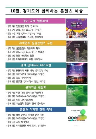 경기도와 경기콘텐츠진흥원이 문화콘텐츠 창작자에게는 공연·전시 기회를, 도민에게는 콘텐츠 체험 기회를 제공해 창작자와 도민 간 소통·교류의 장을 마련하고, 콘텐츠 산업 저변확대를 위해 10월 한 달간 웹툰·문화기술 등 콘텐츠 관련 행사 5개를 연이어 개최한다.