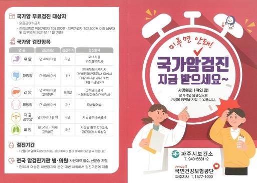 파주시는 저소득층 암환자의 경제적 부담을 최소화하기 위해 암 진단 검사비용, 암 치료에 드는 비용 및 약제비를 지원하고 있다.