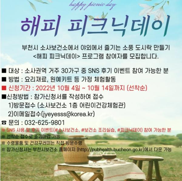 부천시 소사보건소가 소사권역 거주 30가구를 대상으로 ‘해피 피크닉데이’를 운영하며 10월 4일부터 참여자를 모집한다.