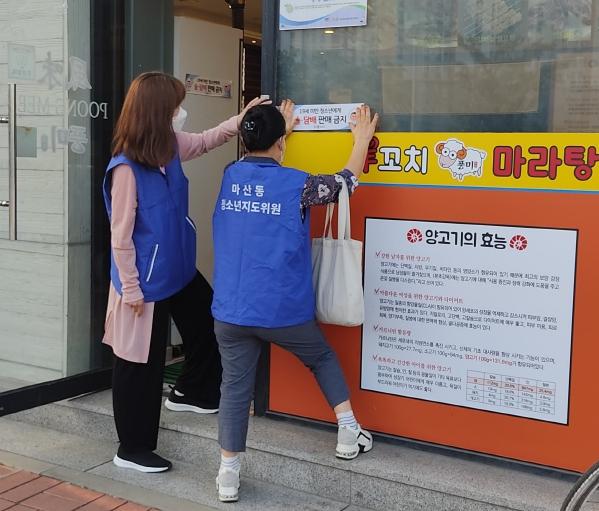 이번 활동은 마산동행정복지센터 인근 편의점, 식당 등에서 이루어졌으며 캠페인 활동을 통해 유해환경 개선 및 청소년 보호의식 확산 등 건전한 사회분위기 조성을 위해 실시됐다.