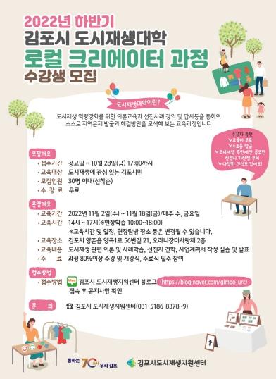 김포시 도시재생지원센터는 ‘2022년 김포시 도시재생대학 로컬크리에이터 과정’ 수강생을 오는 10월 28일(금)까지 모집한다.