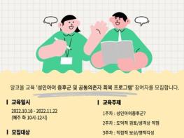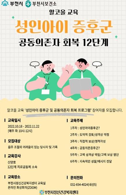 부천시보건소와 부천시정신건강복지센터는 음주 폐해를 예방하고, 올바른 음주 지식을 함양하고자 10월 18일부터 11월 22일까지 ‘성인아이 증후군 및 공동의존자 회복’을 주제로 알코올 교육을 개최한다.