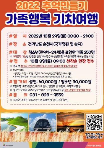 의정부시청소년수련관은 코로나 바이러스 등으로 여행이 어려웠던 관내 청소년가족들에게 가족 간 소통의 시간과 행복한 여행을 제공하고자 2022 추억만들기“가족행복 기차여행”참가자 250명을 10월 8일 오전 9시부터 청소년수련관에서 선착순으로 모집한다.