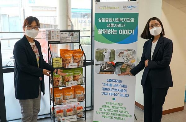 협약에 따라 샘물자리에서 생산하는 누룽지와 국수 무인판매대가 상동종합사회복지관에 설치됐다. 이에 대한 수익은 장애인고용유지와 지역사회 취약계층 지원을 위해 사용될 예정이다.