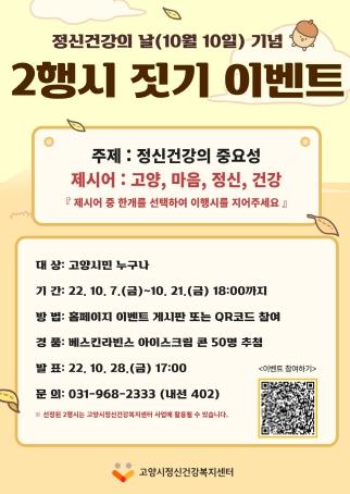 고양특례시 정신건강복지센터가 고양시민의 정신건강 인식개선 활동을 위해 정신건강의 중요성을 주제로 온라인 이벤트 ‘2행시 짓기’를 10월 21일까지 진행한다.