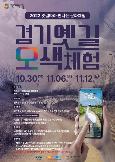참가자들은 경기옛길을 걸으면서 스마트폰을 활용해 역사?문화?생태 등의 교육 미션을 수행하고 다양한 공연도 즐길 수 있다. 참가 신청은 경기옛길 누리집(ggcr.kr)에서 할 수 있다.