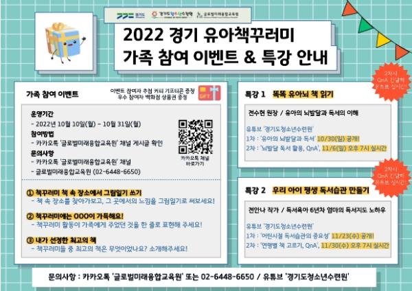 경기도가 독서의 계절, 가을을 맞이하여 ‘경기도 유아 책꾸러미’ 사업참여자를 대상으로 10월 10일부터 11월 30일까지 다채로운 행사를 준비하여 운영 중이다.