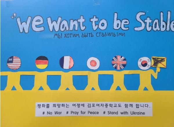 한편, 김포여자중학교는 혁신학교로서 학생들의 삶과 연계되는 다양한 수업 활동을 통해 진행하고 있다. 이번 우크라이나 수업 또한 혁신학교의 수업 활동 중 하나로 수업에 참여한 학생들은 우크라이나의 고통과 현실에 공감했으며 진심으로 응원하고 평화를 바라는 마음을 담아 진지한 태도로 포스터를 제작했다.