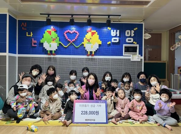 특히 범양어린이집은 코로나19 유행 전부터 꾸준히 ‘시장놀이’ 수익금을 기부해왔으며 올해도 수익금 전액을 전달하며 회천2동 이웃사랑에 앞장섰다.