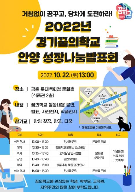 경기도안양과천교육지원청은 10월 22일 안양지역 꿈의학교 참여 학생 및 운영 주체, 꿈의학교에 관심이 있는 시민을 대상으로 평촌 롯데백화점 문화홀에서 ‘2022 경기꿈의학교 안양 성장나눔발표회’를 개최한다.