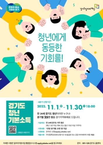 경기도가 만 24세 청년에 분기별 25만 원을 지급하는 ‘청년기본소득’ 2022년 4분기 신청접수를 11월 1일부터 30일까지 진행한다.