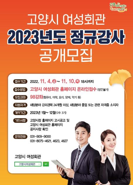 고양특례시 여성회관은 지난 10월 '여성회관 시민 희망강좌 설문조사'를 실시, 시민 633명의 응답 결과를 분석해 수요를 반영한 2023년도 정규 과정 98강좌를 담당할 우수한 강사 확보를 위해 공개 모집을 실시하고 있다.