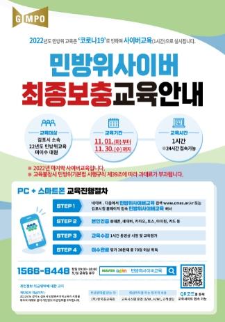 김포시는 2022년 민방위 사이버교육 상반기 본 교육(3.21. ~ 06.30.), 하반기 보충교육(08.01. ~ 09.30)을 정상적으로 종료했으며, 대상인원 약3만1천여명 중 2만8천여명이 이수하여 이수율은 약 89%로 약3천여명의 대원이 현재까지 사이버교육을 미이수했다.