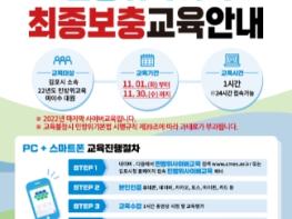 이에따라, 김포시는 사이버교육 불참자 및 신규 편성 대원을 대상으로 하반기 마지막 보충교육을 11월 01일부터 11월 30일까지 실시하며, 교육 참여 통지는 모바일 전자고지로 11월 01일부터 11월 08일까지 발송한다. 미수신 대원에게는 11월 중 등기우편으로 안내할 예정이다.