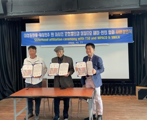 이번 협약식은 김동구 대성동 이장, 김원준 워싱턴주 팬 아시안 문화재단 부회장, 머킬티오 재미 한인협회 제임스 유 ACE메탈 최고경영자(CEO) 등 50여 명이 참석한 가운데 진행됐다.