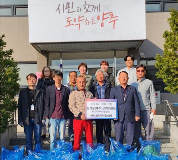 양주 산북3통 주민협의체는 지난 10월 31일 양주1동 행정복지센터를 방문해 배추와 무 100묶음을 기부했다.
