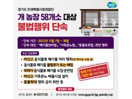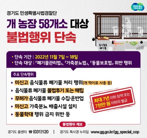 경기도 민생특별사법경찰단은 11월 7일부터 18일까지 음식물류 폐기물로 먹이를 주는 개 농장 58개소를 대상으로 불법행위를 집중 단속한다.