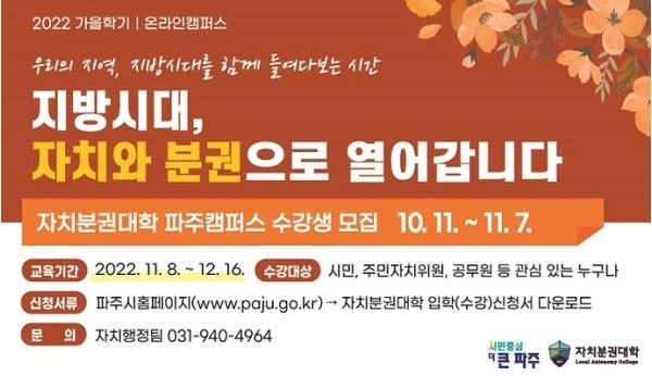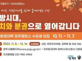 파주시는 새롭게 열릴 지방시대를 맞아 ‘자치분권대학 파주캠퍼스 2022년 가을학기’를 개설한다.