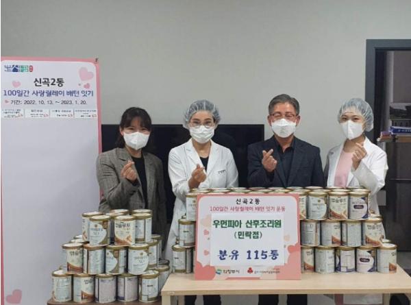 의정부시 신곡2동주민센터는 10월 31일 우먼피아 산후조리원 민락점에서 신생아 분유 115통을 기탁했다고 밝혔다.