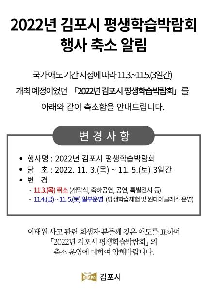 김포시는 국가애도기간 지정에 따라 오는 3일부터 5일까지 개최 예정이었던 ‘2022년 김포시 평생학습 박람회’를 축소 운영한다고 1일 밝혔다.