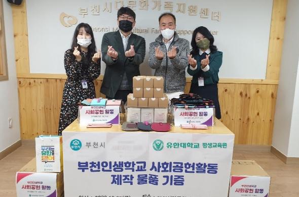 유한대학교 평생교육원은 사회공헌 활동의 일환으로 지난 10월 28일 부천시다문화가족지원센터에 부천인생학교 수강생들이 직접 수제로 제작한 물품들을 지역사회에 환원한'사회공헌활동 제작물품 기증식'을 진행했다고 밝혔다.