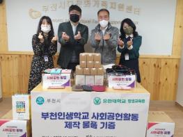 이날 기증된 물품은 부천시가 지원한 부천인생학교 과정을 통해 배운 프로그램 중 수강생들이 교육과정을 이수하면서 제작한 △ 카드지갑(레더놀이 가죽공예 과정) △ 핸드폰가방 및 가죽필통(핸드메이드 가죽가방 마스터 과정) △ 천연비누(맞춤형 화장품 조제관리사 과정) △ 드립백(음료! 제대로 알고 즐기기 과정) 등 총 5개 물품(총 174점)을 기부했으며, 특히 수강생들이 한 땀 한 땀 수제로 만들었다는데 의미가 있다.